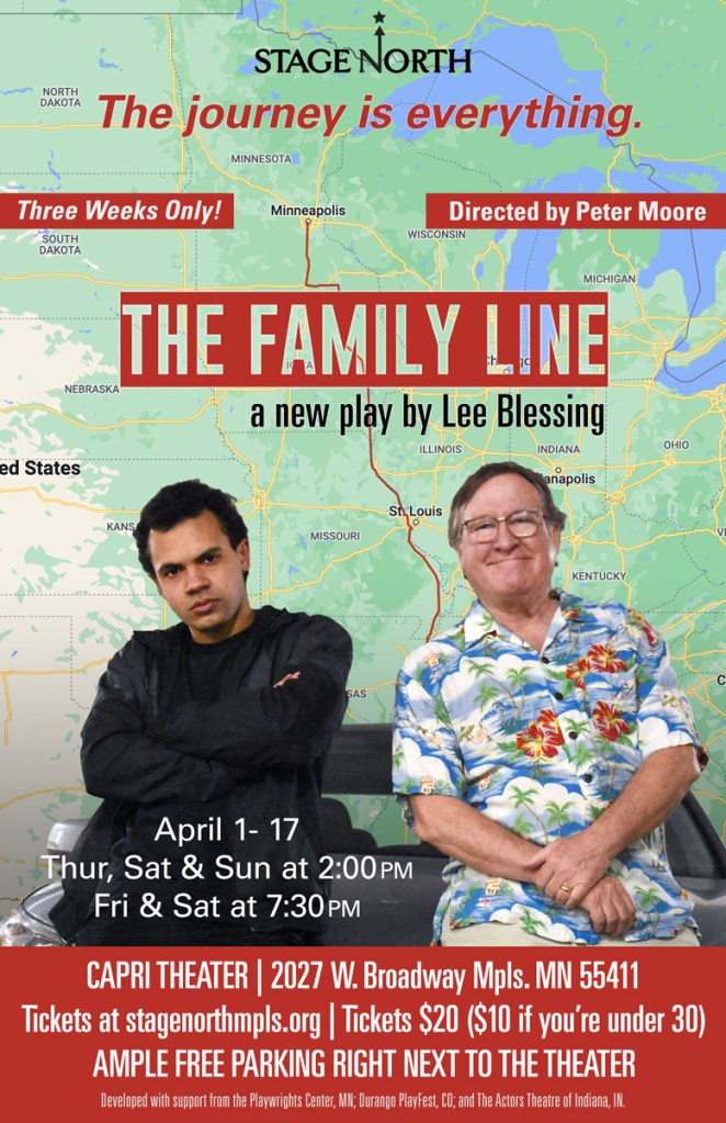 The Family Line is playing through April 17th at the Capri theatre in North Minneapolis. There is ample free parking in a well lit lot directly west of the building. For more information and to purchase tickets go to https://stagenorthmpls.org/.