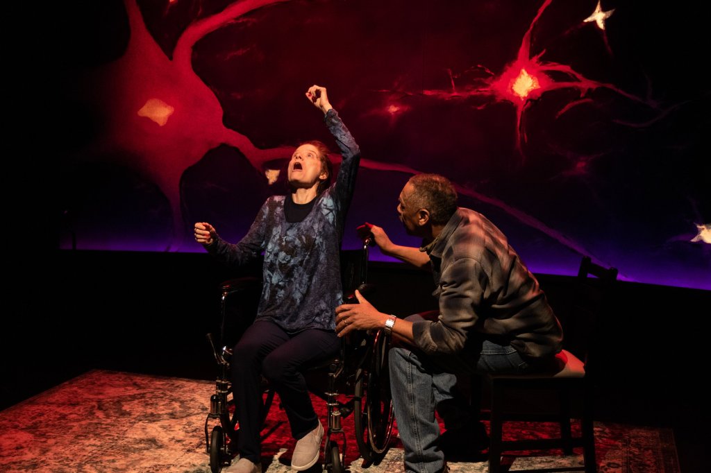 Aside from Carl and Barb, the cast includes Laura Esping as a Healthcare Worker, she plays more than one and is the stand in for those in the medical field that interact with Barb and Carl. Esping does a good job with what’s really a role to fill in information. The show runs about 65 minutes, the material could definitely be expanded to a 90 minute runtime. There could be more for the Healthcare Worker to do, and we are left wanting more time with Barb and Carl. I would have no problem spending an Act 2 with Barb and Carl as they get the idea for and figure out how to collaborate on a play about the situation. I’m not criticizing Brown’s play, which I think is deeply moving and effective, I’m encouraging him to tell us more. The performance space is small and intimate with not much in the way of set, but for a large painting hanging behind the actors that shows us a representation of neurons. The painting changes with the lighting effects with red and blue flashing lights when the ambulances are on their way with sirens blaring. It’s simple but a nice way to symbolize the role the brain has played in what has transpired and suggest things that would be impractical to show. The Scenic Design is by Dean Holzman, Lighting by Alex Clark, and Sound by C. Andrew Mayer.