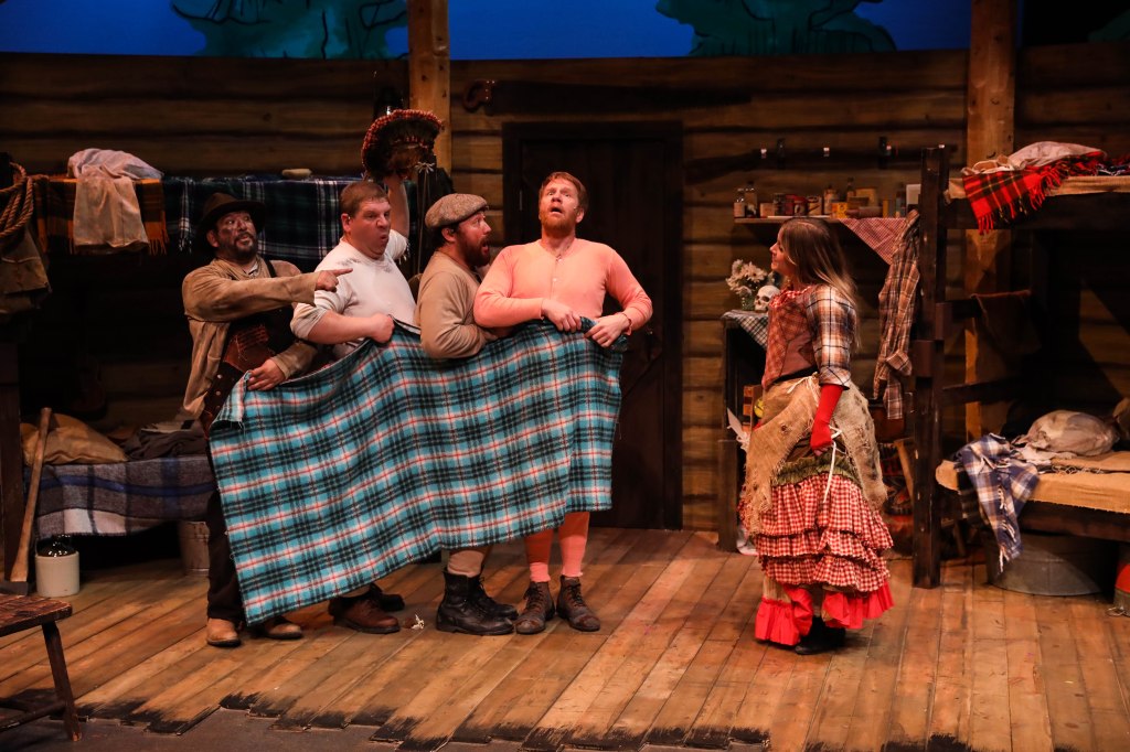 Lumberjacks in Love has a book and Lyrics by Fred Alley and music by James Kaplan. Alley is clearly inspired by Shakespeare, with several jokes playing off lines from Hamlet and Henry V early in the play, and the plot is full of ladies disguised as men. The story focuses on four lumberjacks: Moonlight, Minnesota Slim, Muskrat, and Dirty Bob at a logging camp way up north. Also in camp is “The Kid,” who is secretly the daughter of another lumberjack who died after bringing his “son” up to the camp after his wife passed away. Each of them have their own little plot thread. Muskrat is turning 40 and having the lumberjack equivalent of a midlife crisis. Moonlight finds he is falling in love with “The Kid.” Minnesota Slim receives a letter and realizes that Dirty Bob took his drunken idea to heart one night and sent away on his behalf for a mail order bride who will arrive the next day. Dirty Bob hasn’t bathed in 31 years and will not until he finds a bar of blue soap like his mother dropped when he was a boy. There’s a lot more to unpack with Dirty Bob but let’s leave a little mystery on the table.