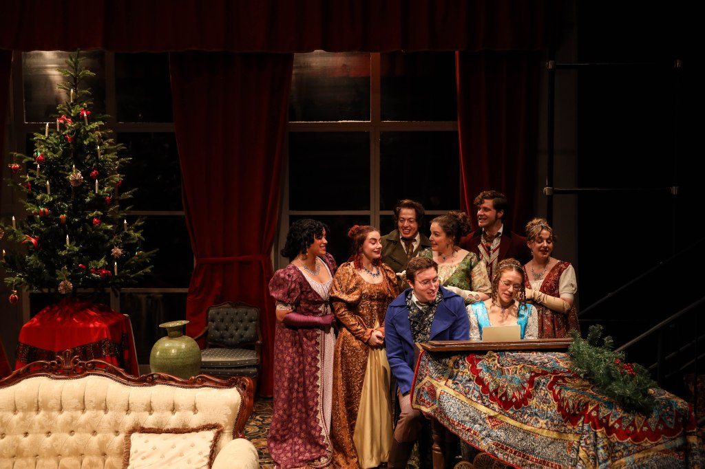 Gunderson and Melcon pick up the story of the Bennet sisters two years after the events in Pride & Prejudice. It is Christmas and Mr. and Mrs Darcy formerly Miss Elizabeth Bennet are hosting Christmas for her family. First to arrive are Mr. and Mrs. Bingley who is Elizabeth’s sister Jane along with their sister Mary Bennet, who is the Miss Bennet of the title. As Pride & Prejudice revolved around the romantic lives of Elizabeth, Jane, and Lydia, who arrives shortly after the others, this one will revolve around Mary, unmarried sister. Kitty, the 5th and youngest sister does not appear nor does Georgiana, Mr. Darcy’s younger sister, though their story is told in the third of the Christmas at Pemberley cycle Georgiana & Kitty: Christmas at Pemberley which is currently being produced by the Jungle Theater in Uptown (watch for a review of that play later in the week). Also in attendance is Arthur de Bourgh who has just inherited the estate of his late aunt Lady Catherine de Bourgh who tried to come between Mr. Darcy and Elizabeth in P&P on behalf of her daughter Anne who also appears in this story. It becomes obvious that Mary and Arthur are cut from the same cloth as soon as they meet, but as always seems to be the case with these Bennet girls the road to happiness cannot be as smooth as simply finding each other. The script addresses themes common in Austen’s work, there are misunderstandings, senses of misplaced duty and responsibility, and subtle critiques of customs and gender roles.