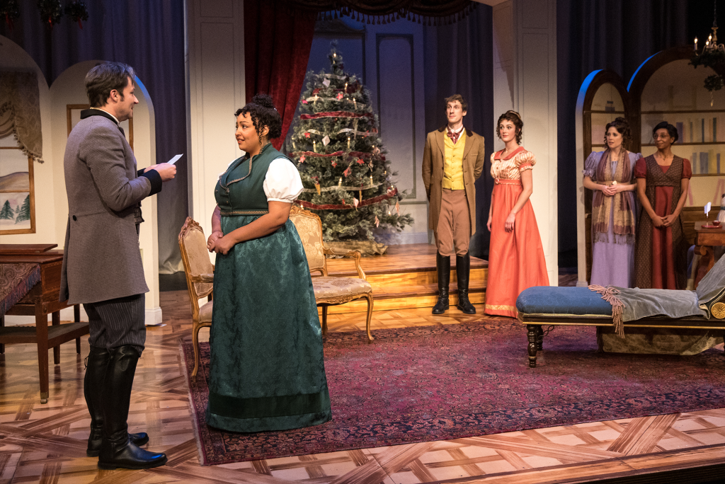 Lauren Gunderson and Margot Melcon once again capture the spirit of Jane Austen’s inspiring source material and create a play that feels like an organic progression for all of the characters. This story focuses on Georgiana Darcy, Mr. Darcy’s younger sister, and Kitty Bennet, Lizzy Darcy’s youngest sister. It’s their turn to find and possibly lose love. The two girls have become the best of friends and spend much of their time together. For Georgiana, love comes in the person of Henry Grey whom she has only met once after a Piano recital but has been corresponding with via letters for almost a year, has invited him to visit on Christmas. They both have fallen in love with each other through their letters and a shared passion for music. When they finally meet again at Pemberley, they are both so shy it will require their friends and family to get them to come out and tell each other how they feel. Accompanying Henry is his friend Thomas O’Brien who is instantly smitten with Kitty. So now we have the two pairs of lovers and in true Austen form, there will be letters that reveal secrets, arranged engagements, and meddlesome siblings. Not the least of which is Mr. Darcy who by the end of Act I will have seemingly torpedoed the match between Henry and Georgiana. Act II takes place about six years later, I mention this because the playbill doesn’t, and it should.