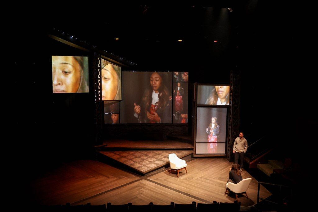 Laura Baker stars as Rachel, the girl on the train, she has a tough role in that we have to be rooting for her even as we observe her troubling behavior and watch her earn her own way onto the list of suspects with her lies. On the surface she is a character who drinks until she can’t remember what she did or saw, stalks and harrasses her ex-husband and his new family, insinuates herself into the life of the missing girl’s husband, and tries to get the missing girl’s therapist to divulge confidential information, and it isn’t really out of some high minded effort to solve the mystery, but to fill holes in her own life. That despite all of this behavior we are still rooting for Rachel is a testament to the way Baker shows us the vulnerability underneath all of these actions. She’s supported by a solid cast. Standouts for me were Jack Bonko as Scott Hipwell, the missing girl’s husband who like all of the performers outside of the Detective in charge of the case have to play the part so that we can read their behavior as innocent or guilty. Bonko walked that line perfectly, always keeping you guessing if he was menacing or messed up. In one of the smaller roles Grace Hillmyer as Anna, the new wife of Rachel’s ex Tom, does a lot with little stage time. Doc Woods makes for a great detective, he baits Rachel expertly, and also delivers with droll logic the ways in which she keeps making herself more and more a person of interest to the police. Rounding out the cast are Jonathan Feld as the ex husband and Austin Moores as the missing girl’s therapist. They are all suspects and all give us reason to suspect them, but also reason to dismiss them via their performances. Finally the missing girl Megan is played by Ninchai Nok-Chiclana, who is seen through a very effective use of video projection onto the flats of the set design.