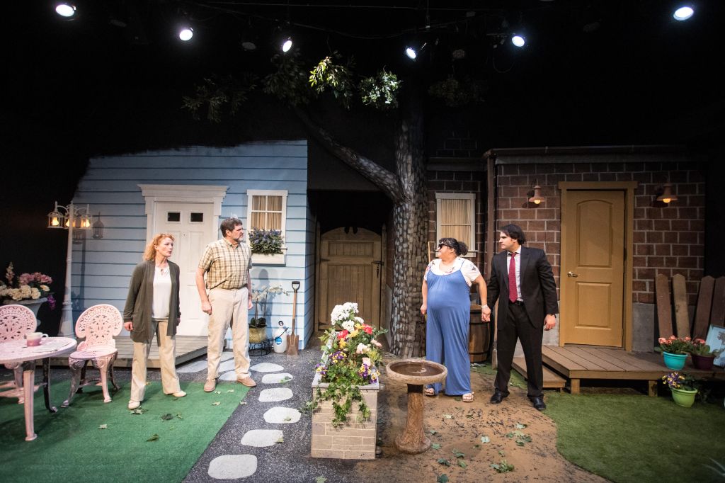 Native Gardens was directed by Adlyn Carreras and she has a real feel for these characters and the situation. She finds the balance not letting the border dispute slide too far one direction or the other, realizing that staging it as she does, she can draw more people into the characters headspace. If we can see ourselves in both sides, maybe we can find the way towards compromise in our own lives. Robin McIntyre’s set design makes the best use of a stage that is a bit on the smaller size. As you can see in the photo at the top of the review the setting is the adjoining back yards of the two neighbors houses, both of which are well realized. My favorite element is the great oak tree in Pablo and Tania’s yard. It’s something that could have been just suggested by the dialogue and looks off stage or into the audience to indicate where it was located. I love that they actually built it and it looks great.