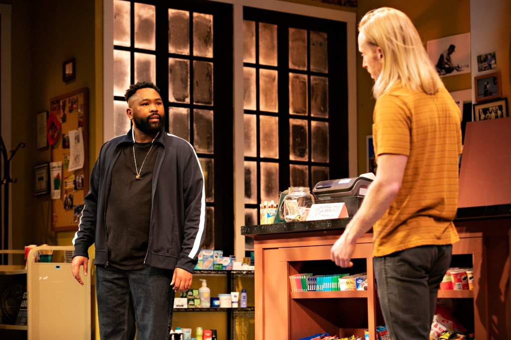 Scenic Designer Chelsea M. Warren has created an environment that feels like it has the history and familiarity of a corner store that these characters have been mucking around in their entire lives. The front door to the store is perfect and the way in which JuCoby in particular uses that downstage space to remind drivers they can’t park there, really adds a feeling of a specific location. The set is filled with details that look like more then set dressing and the combination of the space. Props by John Novak, and Lighting Design by Bill Healey, really immerse the audience in the story. Dan Dukich as Sounds Designer along with Healey’s Lighting Design also create bizarre moments of unease and a sense that there are more things in heaven and earth… The entire production feels as though each department made their plan in talks with the others, then everything was gone over with a fine tooth comb. Giving every refrigerated case, every bag of chips, every cassette tape an extra measure of meaning and relevance. 5 is a brilliantly written, performed, designed and directed show. H. Adam Harris has fashioned a theater piece that entertains us, makes us question the characters and ourselves and even surprises us. It feels cohesive and real in a way that theater rarely does and then it still is able to add elements of the fantastic without losing it’s tone or grounding.
