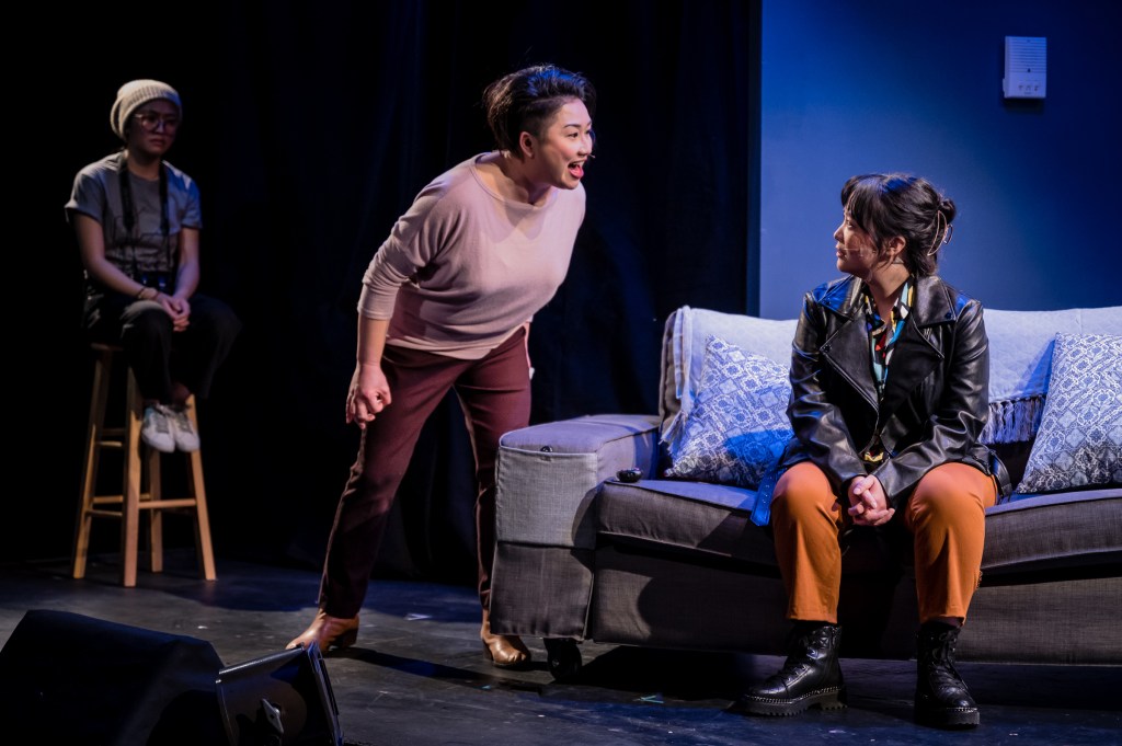 The production is directed by Nana Dakin who isn’t afraid to take the show in a whimsical direction at times. Deftly switching between reality and fantasy without ever feeling jarring, even switching back and forth during the song “Are You Fucking Kidding Me?”. There are a surprising number of scene changes in the show and Dakin consistently finds ways to hold our attention and focus as the scene changes occur quickly and efficiently onstage. The set is designed by Alice Endo and primarily consists of two wall sections on either side of center stage, which if seen from above would be in the shape of a pie divided equally in thirds. The wall rotates allowing for three separate locations and with some minor redressing they able to add two more locales. It’s a creative and effective design which allows for quick location changes by cast and stage managers, as the walls rotate the set pieces such as a couch or the counter at the bookstore are moved backstage. The lighting is well designed by Erik Paulson who has an active role in creating some of the humor via the clever use of spotlights. Sandy Agustin’s choreography is never too elaborate, frequently acting as extensions of the characters natural movements within a scene. Her work really shines in the movements of Melody Her as Quest, who’s movements are almost always at a more amped up carefree level representative of her characters personality. Her’s performance melds perfectly with Agustin’s moves, she looks completely comfortable and the dances feel spontaneous.