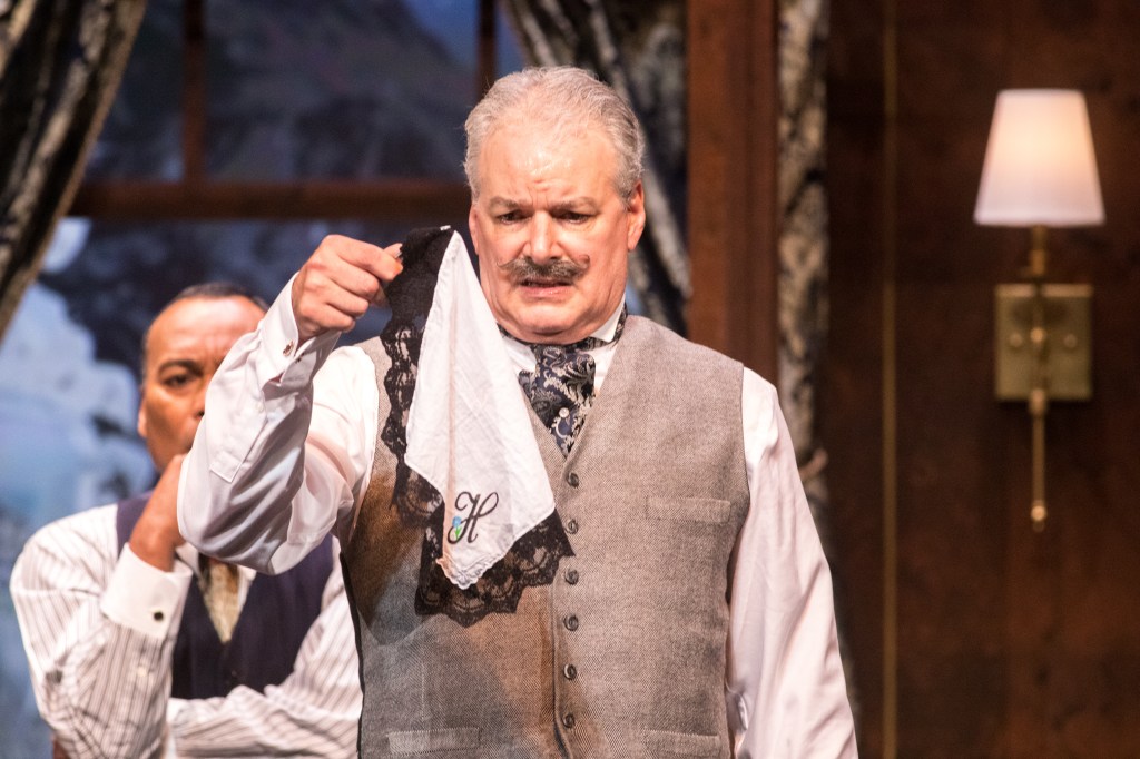 Ken Ludwig has adapted the novel for the stage and in doing so has remained faithful to the mystery of the novel while also putting his own spin on things. Ludwig does a nice job of pairing down the number of suspects from 12 in the original novel to eight for his play. This allows us to get to know and keep straight the different characters, yet still a large enough pool of suspects that it’s never obvious who the real killer is. There’s room to devote a little introductory scene to each of the characters without bogging the play down, in fact it barrels along like a runaway train. Running 2 hours and 20 minutes (including intermission) it feels much shorter. Ludwig’s biggest change, what makes it very entertaining, is the addition of humor. There is a healthy dose of the comedic thriller without crossing the line into Clue territory. Don’t get me wrong, it’s not a mystery comedy but the humor that is there comes from the performances of the cast and it marks the biggest departure for Poirot himself