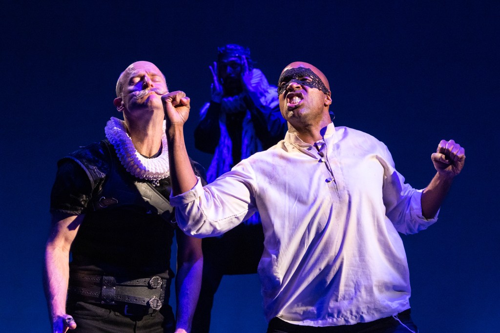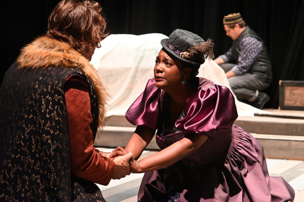 Before I dive into each play, let me say a couple of things generally about all of them. First, there wasn’t a bad performance in any of the shows the entire weekend, so I’ll likely touch on just one or two that really struck me in each. The seating is risers built on the stage in a thrust configuration, it’s wonderfully intimate and as such I don’t think there is a bad seat to be had. Now with the seats on the stage the choice was made for two of the shows to have minimal sets, only Imbroglio has what we think of as a traditional set. The two Shakespeare plays make do with a few set pieces like trunks that can be moved around, but don’t worry, it works. They make up for lack of sets with wonderful costumes, which my fellow bloggers and my wife were kind enough to point out to me. As my wife can attest, I have something of a blind spot for clothes … and jewelry, and hair, and make up. It is in this way, rather than a knowledge of cars or sports, that I present as the male of the species. Lastly, I’m not going to go into plot, there is one play in which it might be difficult to discuss at all without giving away things the audience would find more enjoyable to discover on their own. As for the other two, well you’ve had 400 years, so if you got this far without discovering their plots then go in blind, these plays are so well done, you will not be lost in them.