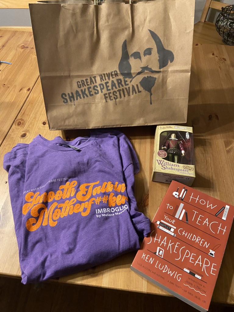 This entry is going to be something a little bit different, I will share some thoughts on each of the plays but I want to focus on the experience itself. This is the 20th season for the Great River Shakespeare Festival. You can learn about how it started as well as what it’s like to perform in repertory theater on the recent episode of the Twin Cities Theater Chat Podcast, which Jill Schafer and Carol Jackson spoke with GRSF Artistic Director Doug Sholz-Carlson and Melissa Maxwell. To listen to that episode click here https://bit.ly/GreatRiverShakespeareFestivalTCTC. There are a few things to know so you get the most out of the festival. 35 minutes before each performance under a little white tent outside the theater, they hold the Green Show followed by Know Before You Go. The first, features actors from the professional understudy company who enact a variety of scenes from Shakespeare’s other plays providing entertaining information about the plays and his techniques. I always compare watching Shakespeare to watching a subtitled Foreign film, it takes about 10 or 15 minutes to adjust or tune into and then once you do, you have no trouble following along. The Green Show helps you tune into the heightened language so that when you go in for the play, you’re primed and ready. In the Know Before You Go portion, they will run down the characters and setting of the play and provide you with a handout cheat sheet to keep all the characters straight. I highly recommend planning to attend these little pre-show sessions, they’re really enjoyable and prepare you to get the most enjoyment out of the performances. Friday and Saturday evenings after the performances there are free ice cream socials during which you have an opportunity to mingle with the cast and crew and compare notes with the other members of the audience. Theater is meant to be a communal experience and this is a nice way to add to that aspect and foster a sense of community, plus ice cream’s awesome! Thursday evenings after the show there are talk backs, and Sunday mornings at 11:00 AM they have Company discussions at Blooming Grounds Coffee House in super cute Downtown Winona. There are other activities and educational opportunities throughout the festival, it really is so much more than just a series of plays. For a full rundown, visit their website at https://www.grsf.org/. Also be sure to leave time to shop at the gift corner in the lobby of the theater, I got a T-shirt to commemorate the occasion, a book and even a William Shakespeare Action Figure.