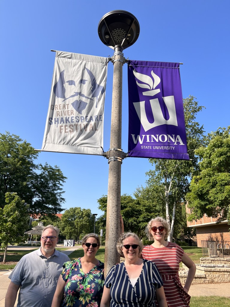 This past weekend I made the journey to Winona Minnesota to attend the Great River Shakespeare Festival (GRSF) for the first time. Luckily, I had my learned colleagues, longtime Twin Cities Theater Bloggers, Jill Schafer of Cherry and Spoon, From MN Theater Love, and the world renowned barber shop duet, the Jackson Sisters with, to show me the ropes. GRSF is a repertory Theater company. For those who don’t know, it’s a company of actors who perform a set of of shows in rotation. Over the course of Saturday and Sunday we saw all three, of the three plays, they have in their repertoire this season: As You Like It, The Winter’s Tale both by Shakespeare, and the World Premiere of a new play Imbroglio by Co-Associate Artistic Director Melissa Maxwell.