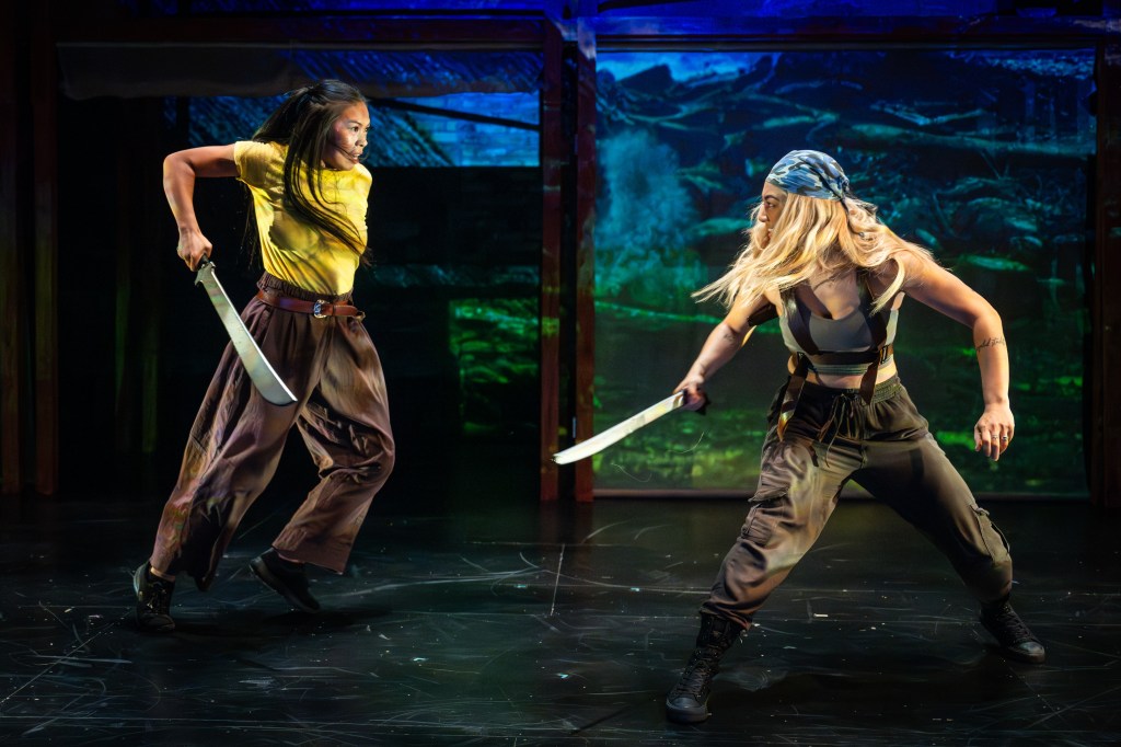 It’s an impressive cast many of them making their Theater Mu and professional mainstage debuts. Hannah Nguyen is one of those, she plays Arun in Act I. I was impressed by her transformation from the the pre-catastrophe girl to the Shaman Warrior she has become by the end of the Act. Michelle De Joya plays Sika, the hero of Act II, the physicality and intensity she brings to the role is one of the greatest joys of this fantastic production. Other standouts include Sandy Agustin as Mae Thao (Arun’s Grandmother the Village Shaman) in Act I and as the old Woman in Act II. Soudavone Khamvongsa who in Act II plays what at first seems like an antagonist but later becomes Sika’s Ally in another amazingly physical performance. Finally, a shout out to Enormvs Munoz who plays Arun’s father in and I believe the Monkey King in Act I and Slim,. a Buddhist Monk in Act II, each character distinct, so much so that I had to consult my program to be sure I was correct in assigning him to all of those roles. Payton J. Woodson as Principal Butcher and the Buddhist Monk Loc in Act II. Woodson’s delivery in both roles is wise, but also deadpan funny, his and Munoz’s handshake routine is a showstopper.