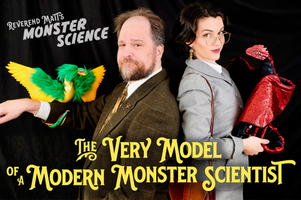 The Very Model of a Modern Monster Scientist is a unique twist on the usual Reverend Matt show. First off I have really enjoyed Matthew Kessen’s Reverend Matt’s Monster Science lectures since I saw my first one at the 2019 Twin Cities Horror Festival (TCHF) What’s different about this version is that while it features moments like his usual lecture formats, this one morphes into a play that introduces a new Character to the Monster Science Universe (MSU, I made this phrase and acronym up we’ll see if it sticks!) in the person of Elora Riley who applies for the position of Monster Science Assistant, she is coincidentally played by Elora Riley. If you like Monsters and deadpan humor about monsters and society you’ll love this and all of Reverend Matt’s shows. I’m excited with the possibility that we will, as Rev. Matt says at the end of the show, being seeing more of Elora Riley in the MSU.