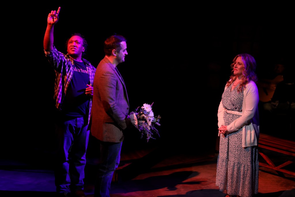 The role of Peter is played by Chris Paulson, whom I first saw in Bright Star at Lyric Arts and has been been doing impressive work in everything I’ve seen him in. Here his slightly sorrowful eyes reflect the longing and hopefulness he’s looking for in seeing Kari again. His boyish face also plays well into the idea that he hasn’t really found himself yet and in some ways is still a lost young man even at 37. The play also gives him a scene to show off his singing. Audrey Johnson as Kari brings an emotional openness to the role allowing the audience to feel her anger and hurt when confronted by Peter. In the second Act, after having vented some of the built up fury she begins to soften, Johnson handles this transition beautifully finding this natural warmth that has been dormant in Kari. She shows us in her eyes that while she didn’t come hoping to see or get back with Peter, that the thought is not a completely foreign one. In the second Act we get a sense of what they felt for each other; so well, you feel the ache of what could have been. The role of narrator and every other character is fabulously performed by Michael Terrell Brown. From his opening monologue which is beautifully conveyed to his complete vocal transformations from one reunion guest to another, he is at once the comic relief and the lyrical and poignant commentator on the unfolding events. The final performer is Steven Ramirez who provides a nice musical accompaniment to the play and has a few small non verbal interactions with the cast.