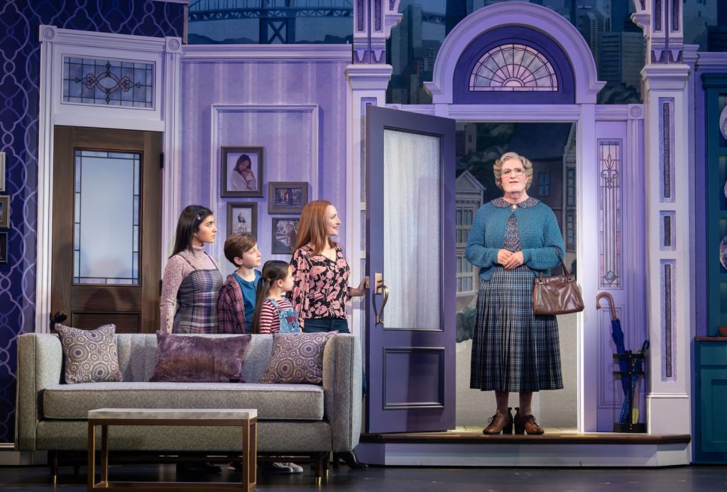 McClure as Daniel Hillard opens the show doing voice over work as an actor, where he runs through several spot on celebrity impersonations trying to improve on the lines he’s being asked to read. He’s quickly fired for being too difficult to work with. This is of course very similar to the beginning of Tootsie. Now that I think about it, I suspect the original film script for Mrs. Doubtfire was written by a Dustin Hoffman fan who took two of his big back to back hits, Tootsie and Kramer vs. Kramer, and combined them into one story. Which brings up another element that worked surprisingly well for this child of divorce and divorced parent, the parent child relationships in the midst of divorce. The divorce aspects of the story are not super weighty but it also doesn’t make light of it either. It’s utilizing a conflict that is familiar to many people as the catalyst for why our hero does what he does. He wants to spend time with his children, so when he discovers his ex-wife Miranda is hiring a Nanny, he enlists the help of his brother Frank and his husband Andre, who work in hair and makeup at a film and TV studio, to transform him into Scottish Nanny Extraordinaire Euphegenia Doubtfire. While playing the situation for laughs it addresses some of the less funny aspects of divorce, successfully maintaining a nice balance of emotional undercurrent without overdoing it or becoming cheesy. While the book by Karey Kirkpatrick & John O’Farrell draws heavily on the film for both plot and jokes, there is enough fresh material to keep the show engaging and to offer some surprises. Two of the best additions are the scene where Daniel is caught riffing with the equipment on the set of a failing Children’s TV show. The other is when he reluctantly steps in as Mrs. Doubtfire to model Miranda’s new clothing line. The only scene that felt a little forced is the first attempt at cooking dinner as Mrs. Doubtfire. There was clearly a requirement that there be a reenactment of the scene where the front of her blouse ends up scorched and she uses the lids of pots to put it out. It feels a little rushed and perfunctory rather than organic. But aside from that 30 second bit, the humor is consistently strong and the audience is laughing throughout the entire show. In fact, that moment is surrounded by a hilarious song “Easy Peasy” that centers around Daniel using his smart phone to watch cooking videos.