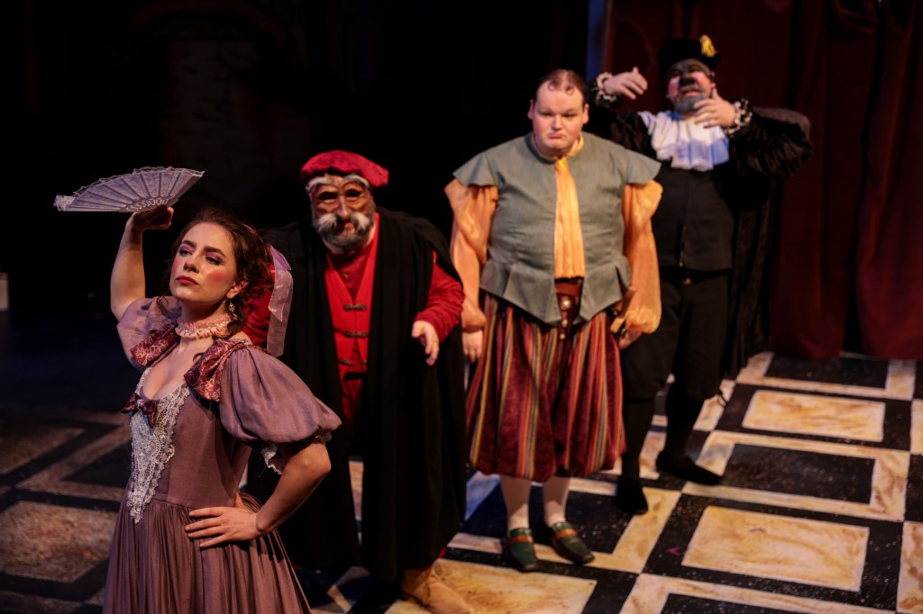 What I loved about this production is the constant awareness that these are actors performing in a very stylized manner. They pose, they ham it up for the audience, and they are not above earning a little on the side by participating in some product placement. There is something freeing about a comedy that lets you know up front it’s not to be taken seriously. In some way it loosens the audience up and the laughs flow freely unabated by any sense of self consciousness. The production is directed by Scott Ford who has directed some of the best shows at Lyric Arts since The Stages of MN came into being and before. Here, his playful approach to the staging, the controlled chaos perfectly watch the style of the script. The use of onstage musical accompaniment, which though providing some background music composed by Melissa Bergstrom, mainly serves to provide comedic sounds to emphasize the buffoonery of the characters actions. Nice to see Callie Aho as the Intimacy Director as the show has a fair amount of risque business, and it’s good to know that there is someone making sure everyone on stage is being cared for so we can enjoy the humorous nature of these moments guilt free. Wonderfully adaptive set design by Michaela Lochen and costumes by Samantha Fromm Haddow make for a nice looking and inventive look to the show. Special praise though to Katie Kaufmann’s Mask Design work which is a hallmark of the commedia dell’arte style, they are beautifully realized and amazingly expressive (see the photo at the top for an example).
