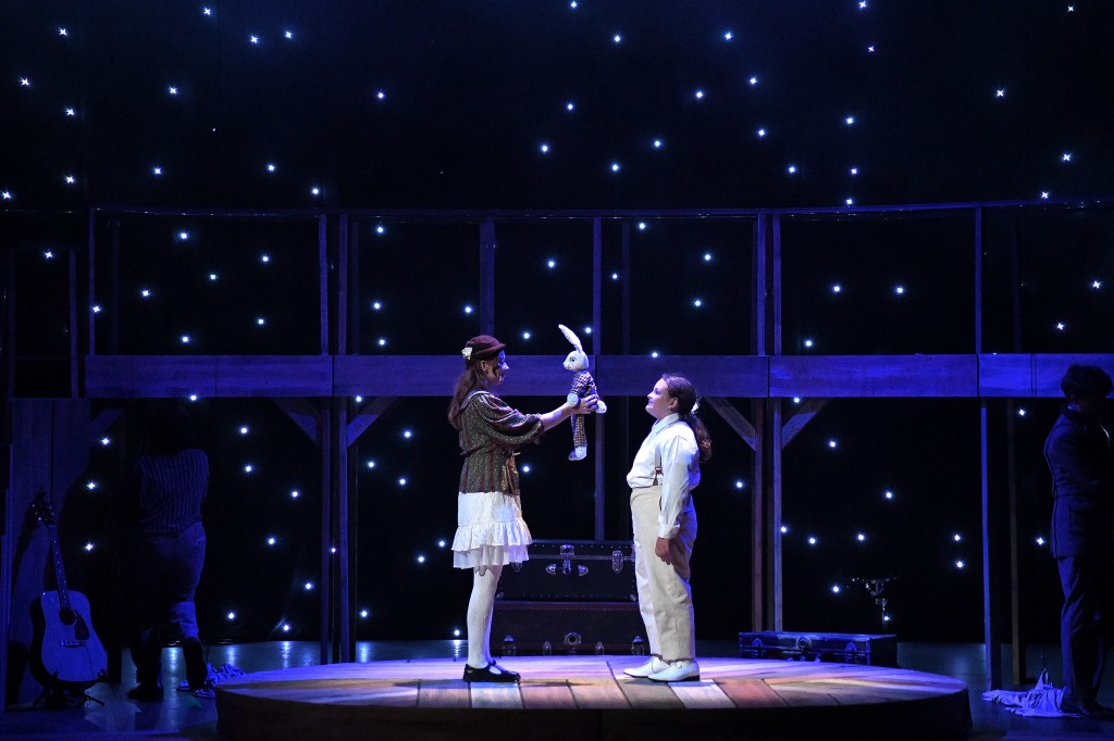 Based upon the novel The Miraculous Journey of Edward Tulane by celebrated Newbery Award winning Minnesota author Kate Dicamillo this production at Stages Theatre Company is warm, emotional, and utterly Charming. I’ve not read the novel but I am familiar with the story from attending the Minnesota Opera’s Edward Tulane in 2022 during its world premiere. The highlight of that show was the extravagant production design while in this version Scenic Designer Sarah Brandner seems to benefit from going the opposite direction. Not that there is no design, it’s that rather than being lavious and detailed here Brandner is subtle, simple, and all the more entrancing for it. Rather than being wowed by spectacle we are drawn in by a design that pulls us into the characters. With moments as simple as the sky lighting up with stars, which the audience I attended the show with, made up of a few hundred grade schoolers were audibly wowed by. They loved it and old as I am, I confess I did as well.
