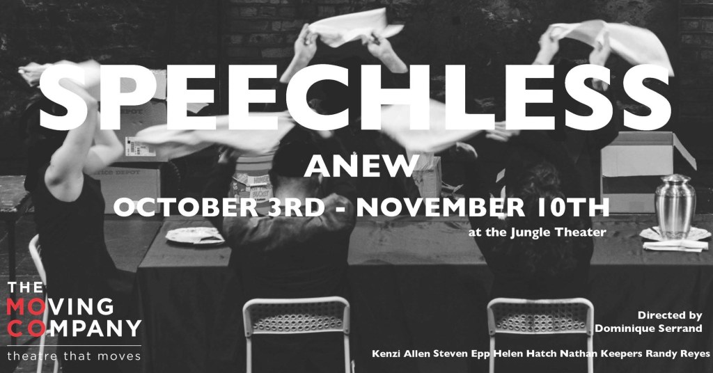 There is hardly anything more I can say without trying to describe the actions they perform, which I will not attempt. I think the information above will give you a road map through which to navigate the show. But, we all bring to something like this our own perception, so don’t feel inhibited by my reading, allow yourself to interpret what you see in your own way. I was more or less speechless after the show, unsure how to process or interpret it, I needed time to sit with it a bit. It’s obviously a sad show at the beginning, but I encourage you to laugh when something touches you as funny. I think one of the lessons is that, even in the darkest times we should find humor when and wherever we can. Speechless runs through November 10th at the Jungle Theater in Uptown. For more information and to purchase tickets go to https://www.themovingco.org/