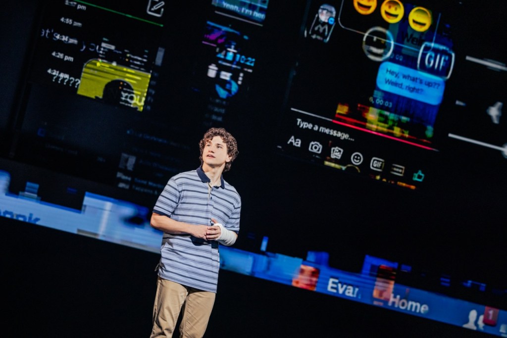 The set design by David Korins which consists of a few tableaus that roll on and off the stage as needed, like a dining room table or Evan’s bedroom is simple but effective. The primary design element though is the projections designed by Peter Nigrini which are cast upon large screen panels staggered throughout the stage. On it, we see social media and texting messages which reminds us of the ways in which today’s teenagers have grown up with this technology. Its constant presence on stage reflects its role in their lives and in a show about alienated and disconnected youth it’s presence is a clue as to why that is. Interestingly, it’s also the conduit by which Evans message that you are not alone goes viral. Steven Levenson’s book for the show wisely shows us the dangers of the technology while also understanding that realistically it isn’t going to go away and so we need to use it positively as well.