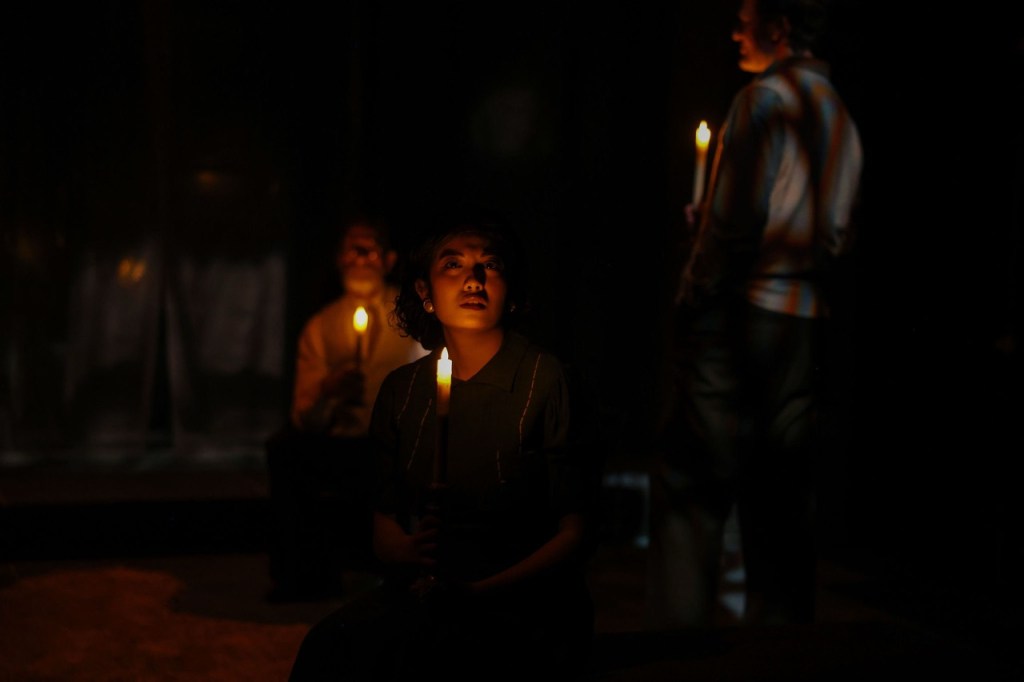 Justin Hooper’s set design is well constructed, with perhaps the exception of the glass doors to the patio, which looked to be made of loosely stretched cellophane. It may have been where I was sitting, off to the side of the stage, as the production photos don’t look chintzy, and they hint at a backdrop that adds interesting visuals I may have missed. What was on full display for all to see, or not, was the lighting design by Alyssa Kraft. It’s one of the more effective uses of candlelight I’ve seen in a show. Usually the designer or director is too timid to let the stage be lit solely by candles, but I’ll tell you, it is very effective. I applaud Kraft for going that route, and Conrads stages everything wonderfully, making full use of the darkness to ramp up the tension and play on our collective fear of it.