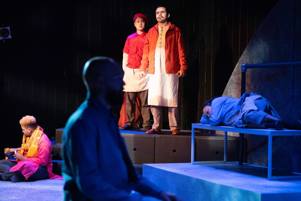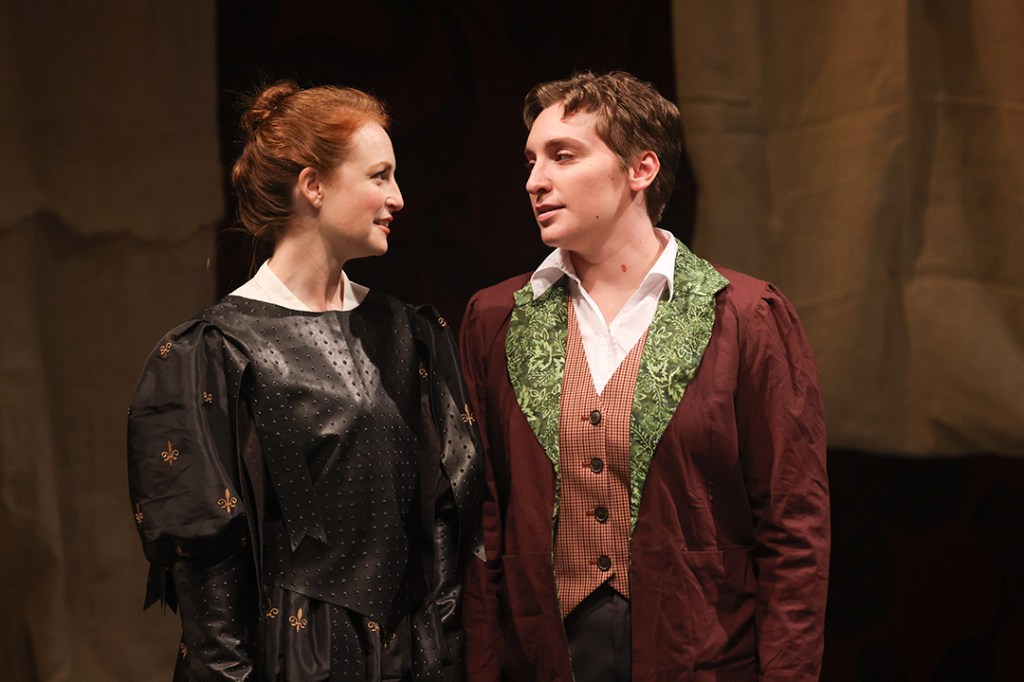 Nicole Goeden plays Bernhardt as someone who is aware of her power and position as well as her celebrity. She gives the impression of someone who simply gets what she wants by doing as she pleases, confident in her ability to inspire submission from those around her, not out of fear but out of affection for her. Her costar and perhaps director Constant Coquelin played by Sean Dillon seems to good naturedly go along with her abrupt desires to work on a different scene in the middle of another one. Dillon plays this with good humor, giving a sense that his character has been through all of this before, and is at peace with Bernhardt’s process. The same is true of Duck Washington’s Alphonse Mucha who creates the posters for Bernhardt’s productions. They are natural and understanding of Sarah’s whims and her gifts, they are friends and collaborators, and both actors convey that nicely to the audience. Em Rosenberg who recently made their debut appearance on the Guthrie stage in Hamlet, how’s that for serendipity, plays Edmond Rostand. Rosenberg is an actor I’ve had my eye on for a while now. I first came across them in the first Theatre Pro Rata show I saw Top Girls. My comments in that review about them began “The stand out for me was Emily (Em) Rosenberg” and that could just as easily be the start of my comments regarding Rosenberg in every show I’ve seen them in including this one. Rosenberg is cast not based on gender but because they are the best actor for the role of Rostand. Every interaction with another character whether it is a passionate embrace with Sarah, an argument with a critic about Bernhardt playing Hamlet, or standing up for his play Cyrano de Bergerac we completely believe this version of Rostand even as we know he is in most ways a fiction of the playwright.