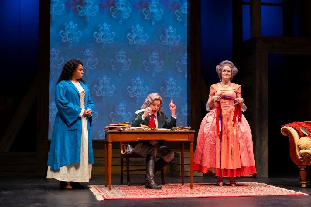 The Revolutionists is a co-production between Park Square Theatre and Prime Productions and is directed by Shelli Place. Place effectively stages the action making dramatic use of a long staircase leading up to the guillotine and the video projection. The set design by MJ Leffler is, as is always the case with Park Square Theatre productions, one of the highlights of the show. With a few simple changes and the assistance of the lighting design by Karin Olson we can be transported from Olympe’s rooms to a prison cell, to the guillotine. The projection designs by Lily Isaacson are sparingly but effectively used. Particularly the blade of the guillotine. Otherwise it’s mostly used to help sell whatever the environment is wherein the action is taking place. The costumes by Sonya Berloviz and wig designs by Bee Tremmel give the look and feel of the play a cohesive sense of period.