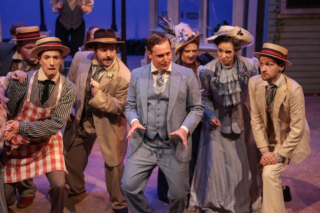 The cast is so strong that rather than use a more dynamic production photo, I wanted to highlight one from the curtain call featuring the entire ensemble. They’re all excellent, though I can only single out a few. Jim Lichtscheidl takes on the largest role as James Wicker, the playwright’s best friend and an actor who turned down the male lead. Not because of his TV series, as he claims, but because he suspects the show is a flop. Lichtscheidl is a master of nonverbal communication, and his body language and facial expressions add immeasurably to the character.