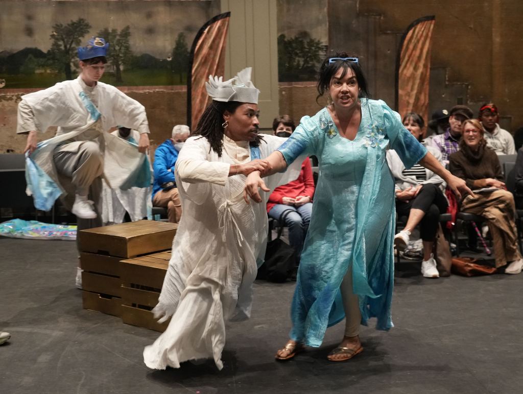 All the pop songs in the world won’t elevate a show without strong performances. Pride & Prejudice has a great cast including several new to me Actors. First and foremost without a strong Lizzy Bennett you’re lost. This production, my first stage show of Pride & Prejudice, though I’ve seen several screen adaptation, features what might possibly be my favorite Lizzy. Eva Gemlo’s performance as Lizzy is sublime, the perfection of which cannot be overstated. It’s a performance perfectly attuned to Theater in the Round’s intimate space. Relying as much on subtle facial expressions and body language as it does on line readings. Gemlo projects Lizzy’s intelligence, wit, and independent spirit while also inviting the audience into her inner feelings, key to building that moment of vicarious joy one feels when Austen’s characters finally realize and find their love. The entire cast is strong including Luke Langfeldt who gets the duality of Mr Darcy. It’s key that we find him as arrogant as Lizzy does in the beginning, and equally as key that we buy the characters growth and are excited by the change in their feelings towards each other. With a knowing nod to the famous Colin Firth performance, he gets his own dripping wet shirt scene. There are some great comic performances, that bring out the playwright and Directors comedic flourishes. Mary Lofreddo plays Miss de Bourgh whose face we never see but whose expressive black rubber gloved hands look like something out of a horror film. Michael Hundevad plays Mr. Bingley as if he were a puppy dog, an aspect played up with a ball as his favorite prop. But the standout of the supporting Actors is Stephanie Kahle as Mary Bennett. Kahle’s expressive eyes are fixed in a hard stare, creating a sense of uneasiness in the her fellow characters whom she is constantly startling. Much humor is derived from Kahle’s unpredictable and often clueless behavior as Mary.